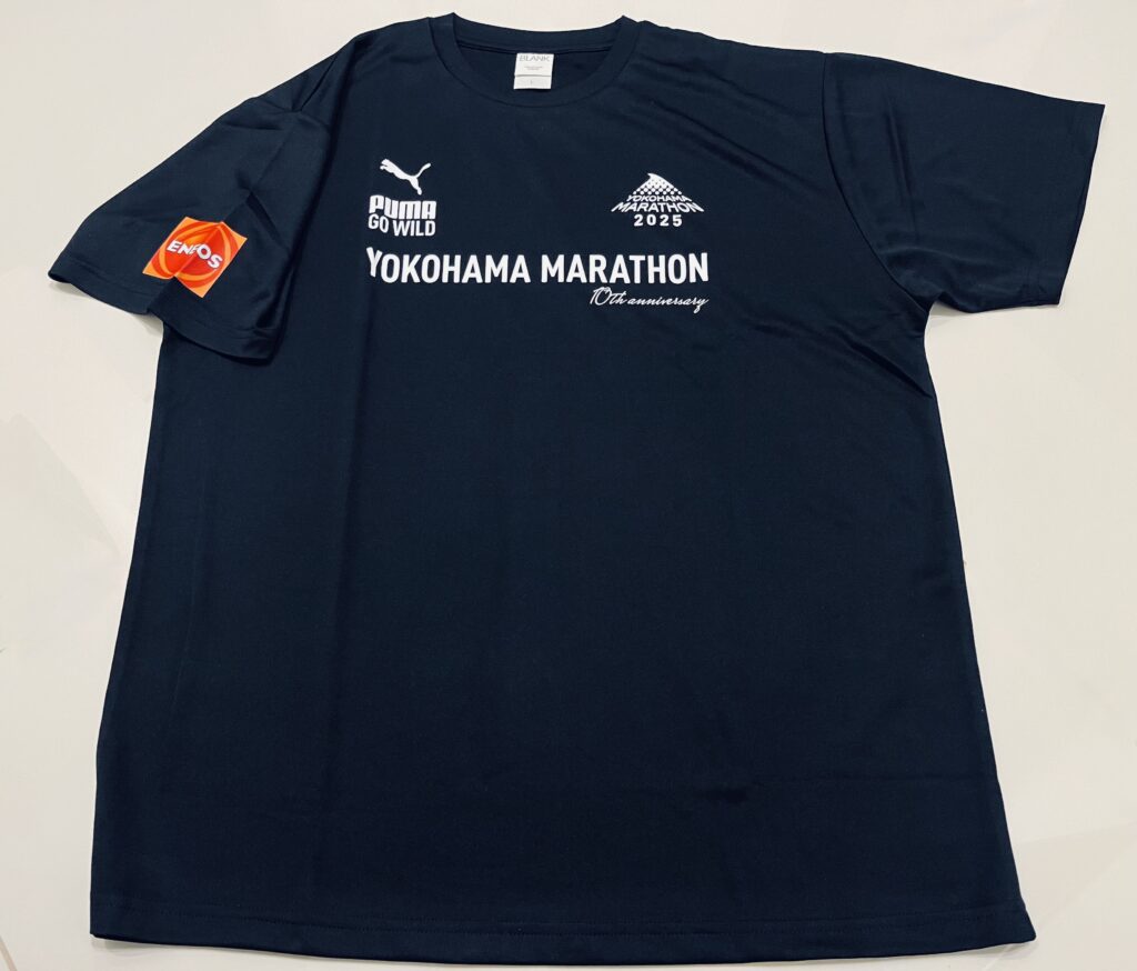 参加賞Tシャツは、素材が軽くて肌触りも良く、普段のジョグにも使えそう。デザインはシンプルなで横浜マラソンのロゴとスポンサー名が書かれているだけ。記念としても嬉しい一枚。