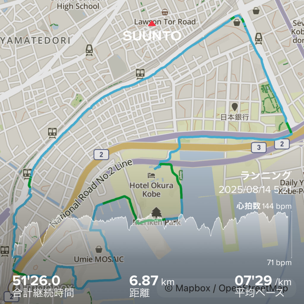 神戸の街と海をつなぐ6.87kmの朝ランは、記録以上に心が満たされる時間だった。次は異人館方面や六甲山のふもとまで足を延ばしてみたい。