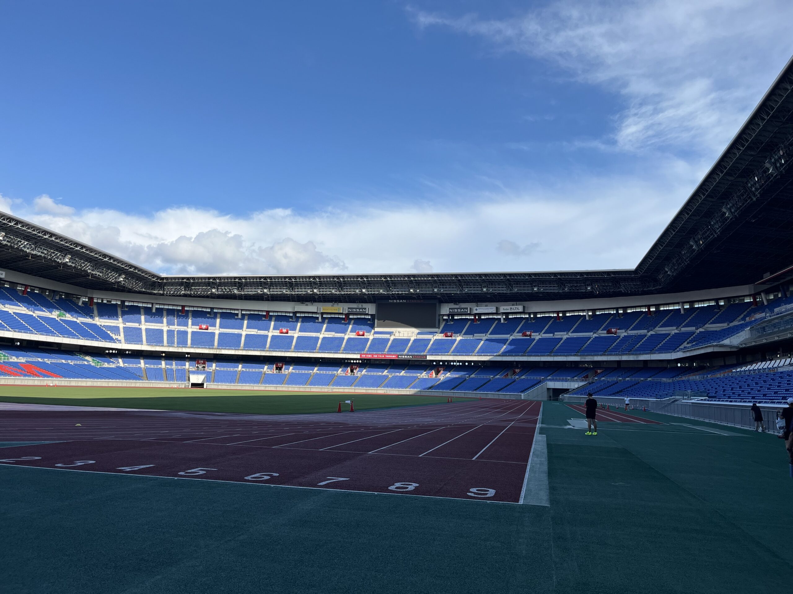受付ではスタッフの方が温かく迎えてくださったものの、周囲のランナーがベテランに見えて少し緊張…。 早めに到着したので更衣室で着替えを済ませ、スタジアムの中へ。スタジアムに来るのは初めてだったので、アップしているランナーたちを端の方から静かに眺めていました。